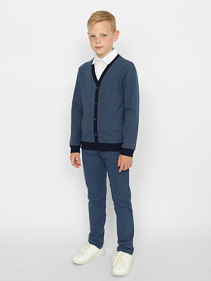 Трикотажный комплект для мальчика, состоит из куртки на молнии с капюшоном и брюк. По низу брючин манжет.