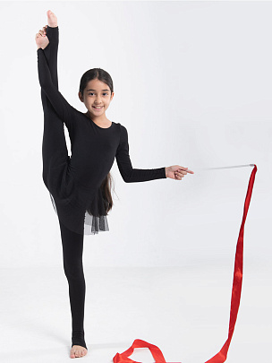 Купальник с длинным рукавом и с юбкой из сетки в цвет основного полотна. Вырез горловины и проймы ножек окантованы бейкой из основного полотна.