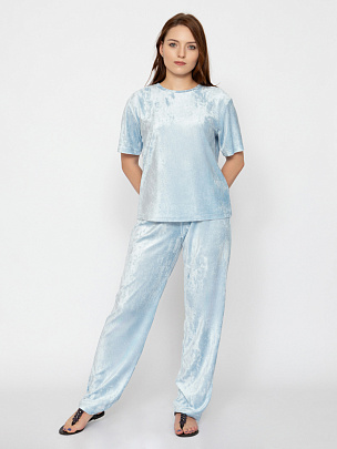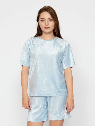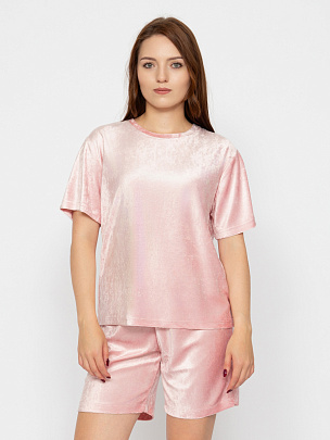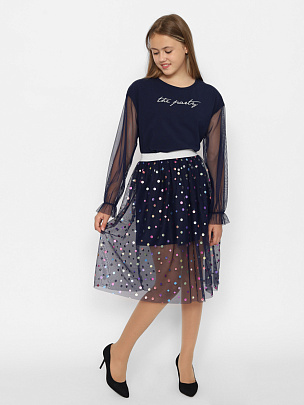 Блузка свободного силуэта с втачными рукавами. Спереди блестящая шелкография цветным глитером. Горловина обработана окантовкой из основного полотна. Рукава из основного полотна. Банты из гофрированная. Ширина волана 10 см.