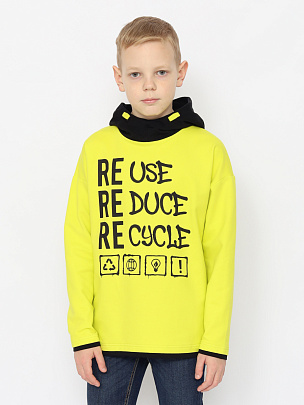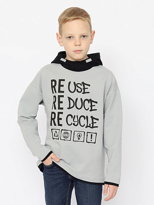 Толстовка с центральной застежкой, длинными рукавами, притачным поясом и манжетами. Манжеты выполнены из полотна с добавлением лайкры, пояс выполнен из основного полотна. Капюшон с отрезной планкой и подкладкой. На передней части расположены рельефы с карманами. Пояс декорирован принтом. Планка капюшона декорирована принтом "Стремись вперед", "Не останавливайся иди вперед".