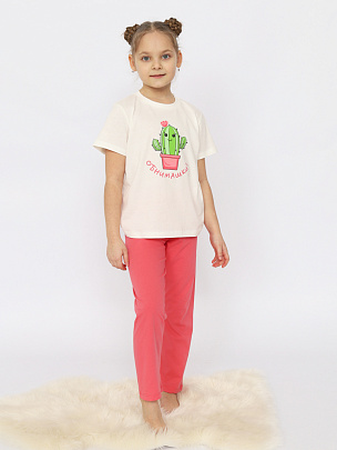 Пижама гладкокрашенная из футболки и брюк. Футболка свободного покроя с коротким рукавом. Горловина обработана притачной бейкой из рибаны с лайкрой. Перед оформлен принтом. Прямые брюки умеренного объёма выполнены из полотна дополнительного цвета. Цельнокроенный пояс обработан плоским швом вподгибку с одновременным прокладыванием резинки.