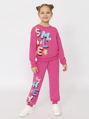 Джемпер для девочки с длинными рукавами. Горловина, рукава и низ изделия с эластичной резинкой. На полочке декоративный принт с блестящим эффектом и надписью - "Улыбнись". Брюки-джоггеры без карманов. Пояс притачной, со вставленной внутрь резинкой. В пояс вставлен шнур. Спереди деворативный принт с блестящим эффектом и надписью - "Привет". Внизу манжеты.