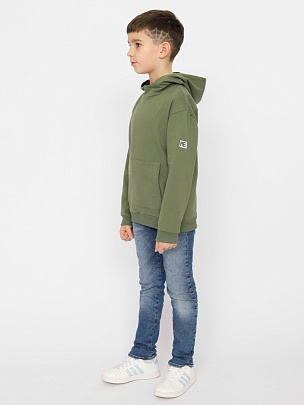 Толстовка для мальчика с капюшоном и карманом "кенгуру" спереди. Капюшон с подкладкой. Рукава длинные, с манжетами по низу. Низ изделия оформлен притачным поясом. Пояс и манжеты выполнены из полотна с эластаном. На левый рукав настрочена жаккардовая этикетка, на карман нанесен принт.