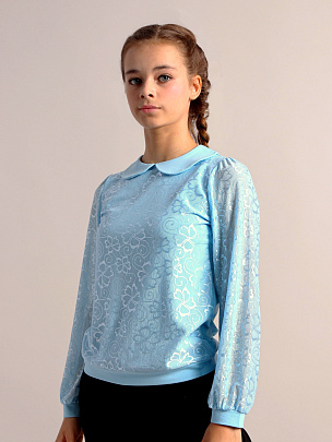 Джемпер для девочки с длинными рукавами и отложным воротником. Рукава из сетки с манжетами из кулирки. Полочка двойная - нижний слой из кулирки, верхний из сетки. Сзади застежка на пуговицу.