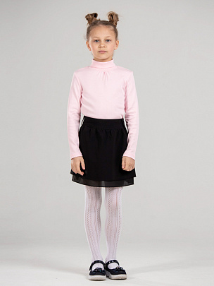 Джемпер для девочки с короткими рукавами, свободного силуэта, спущенным плечом и отложным воротником. Сзади застежка на пуговицу. Спереди декорирован металлическим лейблом.