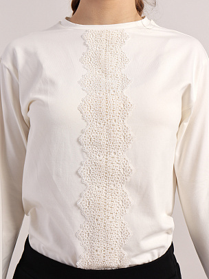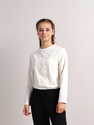 Джемпер свободного силуэта для девочки со спущенным плечом и длинными рукавами. Полочка декорированя кружевом. Воротник из основного полотна.