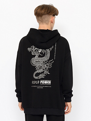 Молодежная толстовка oversize с капюшоном. Рукава длинные, с манжетами по низу. Нижние срезы переда и спинки оформлены притачным поясом. Манжеты и пояс выполнены из полотна с эластаном. Перед и спинка толстовки декорированы принтом (9 сыновей дракона).