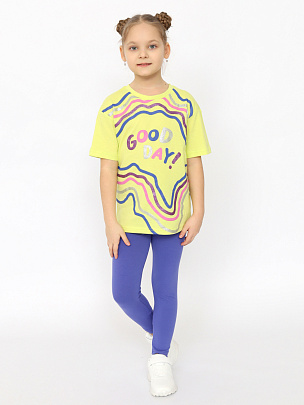 Футболка слегка приталенного силуэта, длиной чуть ниже линии бедер. Рукав 3/4, по низу рукава настрочено эластичное кружево цвета в тон рисунка набивки. Круглая горловина с небольшим разрезом по центру обработана узкой бейкой и декорирована атласным бантиком в тон кружева. Бриджи прямые, слегка зауженные к низу, длиной чуть ниже линии икры.