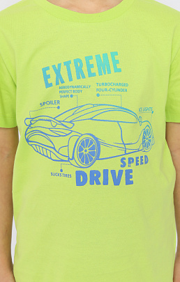 Футболка с коротким рукавом. Горловина круглая, обработана узким воротником из полотна с эластаном. Перед оформлен принтом.