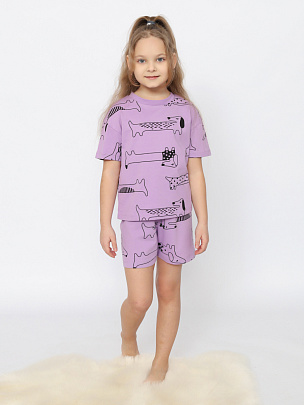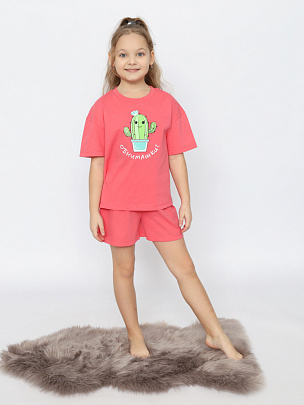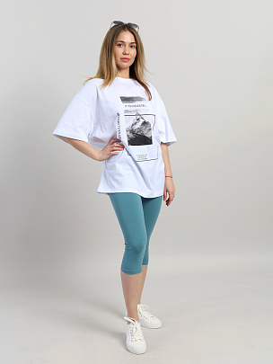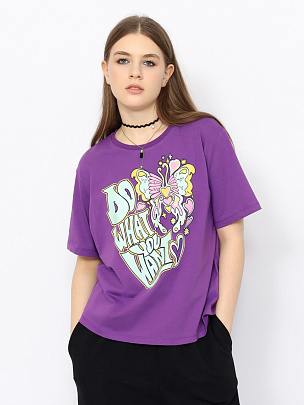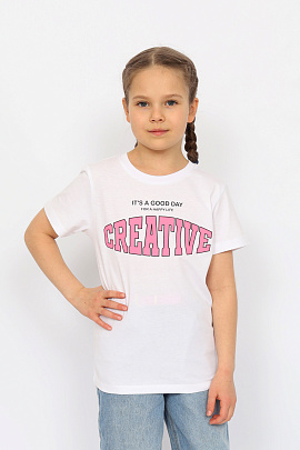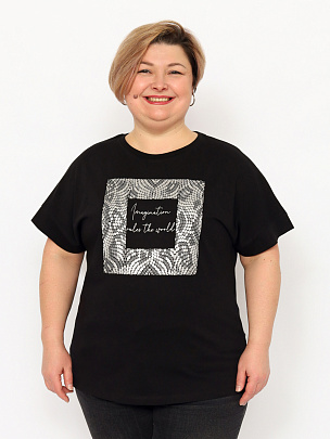 Футболка прямого силуэта с короткими рукавами. Горловина круглая, обработана притачной бейкой из рибаны с лайкрой. Перед футболки декорирован блестящим принтом, имитирующим пайетки.